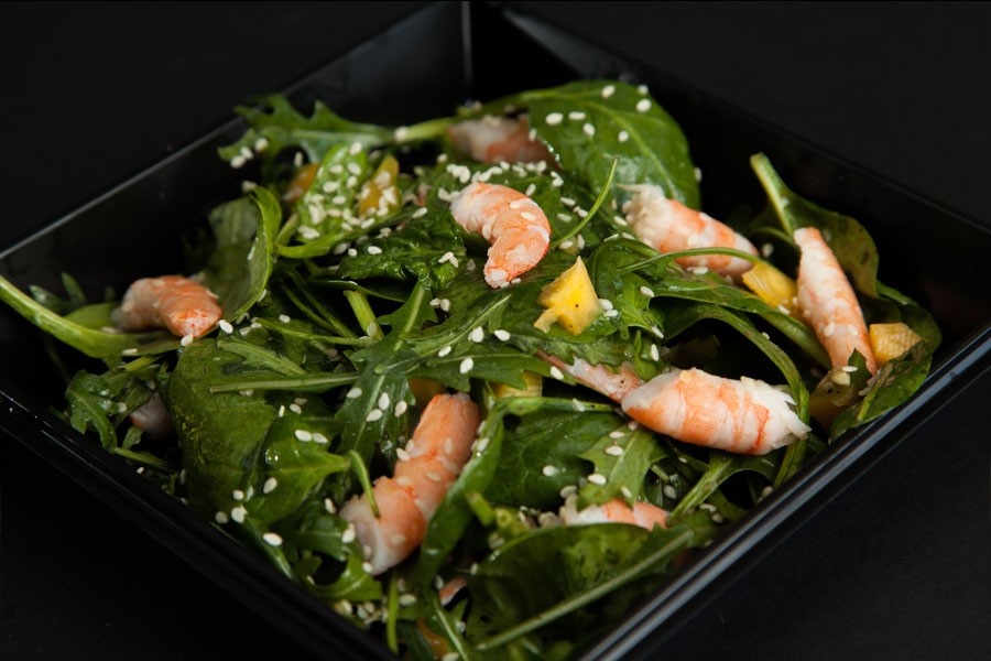 Salades : Méli-mélo de légumes et canard au vinaigre de balsamique, Salade de roquettes et épinards aux gambas, mangue et vinaigrette sésame-citron, Salade de rattes du Touquet parfumées à l'huile de basilic